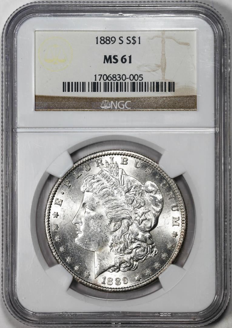 One 1889-S $1 Morgan Silver Dollar Coin NGC MS61. NGC Certified.