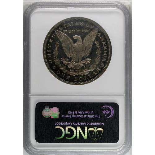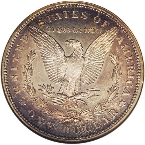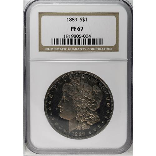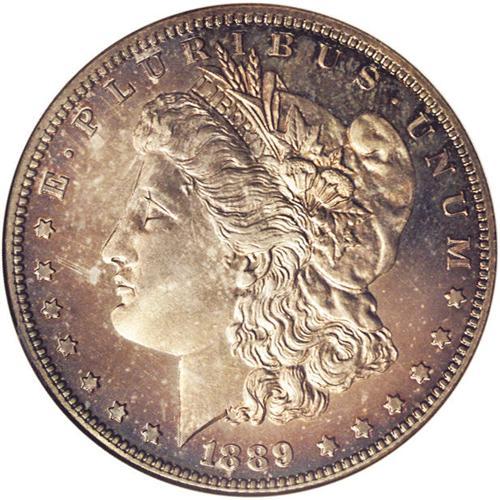 <B>1889<img border='0' src='http://www.heritagecoins.com/images/star.gif' width=10 height=10>$1> PR67 NGC.</B></I> A wonderfully preserved proof dollar with near-perfect surfaces, and a plethora of fully original toning. Both sides exhibit a similar appearance with sunset-golden patina that deepens to crimson-magenta and cobalt-blue at the border areas. A tiny area of planchet roughness is noted in the left reverse field above the olive branch and below the eagle's left wing, this being mentioned only as a future identifier for this beautiful coin. Fully impressed throughout. Census: 5 in 67, 2 finer (5/06).