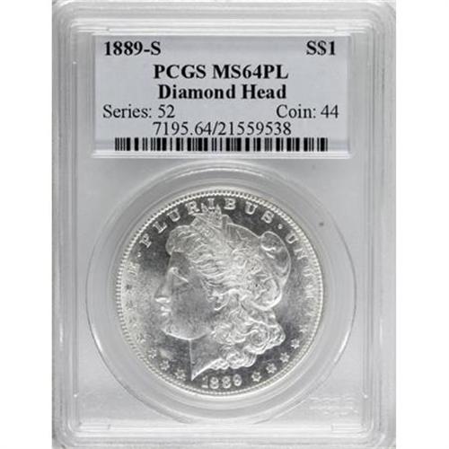 <B>1889-S $1 MS64 Prooflike PCGS.</B></I> Ex: Diamond Head. PCGS Population (33/7). NGC Census: (63/8). Numismedia Wsl. Price for NGC/PCGS coin in MS64: $500. (#7195)<BR><I>From The Diamond Head Registry Set of Prooflike Dollars.</B></I><BR><BR><B>Coin Engraver:</B> George T. Morgan<BR><BR><b>Shipping:</b> Coins & Currency (<a target="_blank" href="http://www.heritageauctions.com/common/shipping.php">view shipping information</a>\)