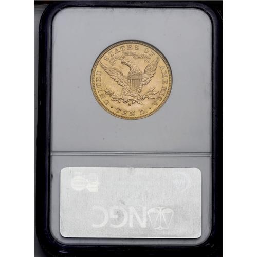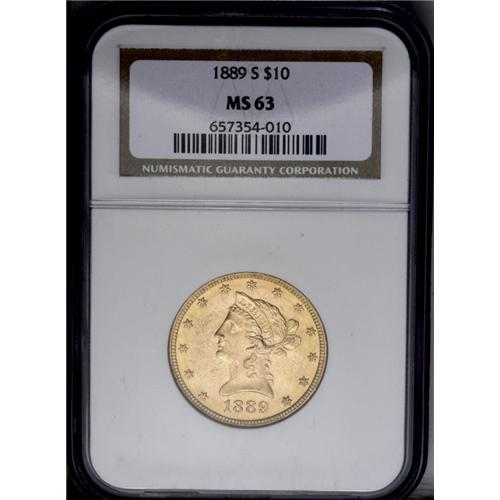 <B>1889-S<$10> MS63 NGC.</B></I> A lovely representative of this conditionally rare issue. Well struck, lustrous, and clean aside from a hidden mark in the hair above the ear. STATES OF is lightly die doubled. Census: 73 in 63, 4 finer (6/06).