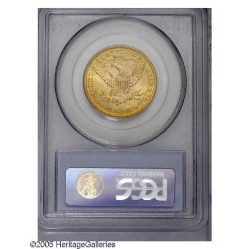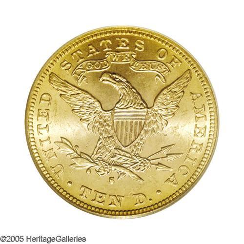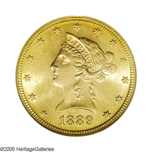 <B>1889-S<$10> MS63 PCGS.</B></I> Clean for the grade, this lustrous peach-gold beauty possesses an exacting strike and a particularly unblemished reverse. The reverse is lightly die doubled between 12 and 3 o'clock, perhaps strongest on the F in OF. The 1889-S is difficult to find above the MS63 level; PCGS and NGC combined have certified only 14 such pieces, as of (9/05).