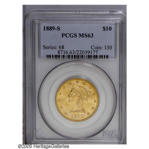 1889-S $10 MS63 PCGS. Clean for the grade, this lustro 1889-S[$10] MS63 PCGS.