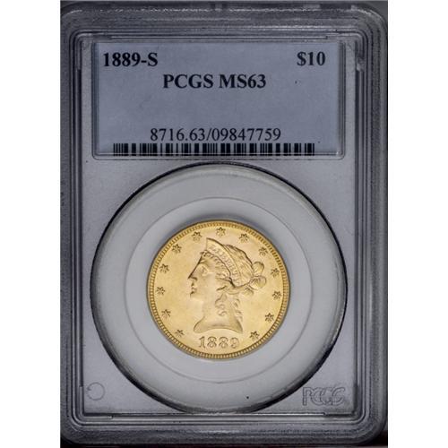 <B>1889-S<$10> MS63 PCGS.</B></I> Sweeping luster and a penetrating strike affirm the quality of this lovely and conditionally scarce eagle. Impressive despite a moderate mark on the forehead. <BR><BR><B>Important notice:</B> Heritage usually auctions material at the rate of 200-250 lots per hour. On some occasions eBay Live bid software or the Internet may not be able to keep up with the pace of the auction. We recommend placing a realistic absentee bid now as insurance to avoid disappointment. Occasionally the auctioneer may eliminate or reject an eBay Live bid, and the auctioneer may also reopen a lot after the close of the eBay live bidding (usually because we missed an audience bid), and may reject your bid even if it shows you as the winning bidder. By bidding via eBay Live, you agree that Heritage may award the lot to another bidder at its sole discretion under the circumstances described above or any other reasonable circumstances. Since eBay bids are not shown to us until we open the lot on the floor, we treat those bids just like floor bids. In most cases the floor responds before the eBay bid is presented to us, due to Internet lag time, so for consistency we have made it a policy that floor bids are always considered first over tie eBay live bids. Also please note that all Heritage lots purchased through eBay Live carry a 20% Buyer's Premium. Please make sure you read the Terms and Conditions before you bid. This lot is being auctioned in conjunction with a live floor auction by Heritage Galleries & Auctioneers. All final auction and invoice information will be supplied by Heritage Galleries & Auctioneers, and all other information should be considered preliminary. Lot:4017 <BR><BR><B>Winning Notification and Billing:</B> After the FINAL session in this auction is complete, Heritage will send e-mail and snail mail invoices. This process normally takes several days. All final auction and invoice information will be supplied by Heritage Galleries & Auctioneers, and all other information should be considered preliminary. <BR><BR>This auction will be conducted on a live auction floor and over the Internet through eBay Live. If you choose to place an absentee bid, please take a moment to <font color='#0000ff'><u><a href='http://pages.ebay.com/liveauctions/help/before/laabsentee.html'>learn how eBay Live absentee bidding works</a></u></font><font color='#000000'>