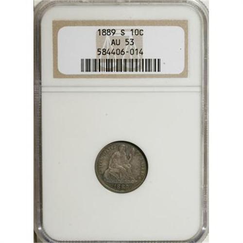 <B>1889-S 10C Small S AU53 NGC.</B></I> NGC Census: (1/60). PCGS Population (0/39). Mintage: 972,678. Numismedia Wsl. Price for NGC/PCGS coin in AU53: $154. (#4703)<BR><BR><B>Coin Engraver:</B> Christian Gobrecht<BR><BR><b>Shipping:</b> Coins & Currency (<a target="_blank" href="http://www.heritageauctions.com/common/shipping.php">view shipping information</a>)