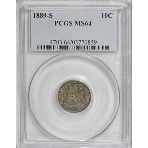 <B>1889-S 10C MS64 PCGS.</B></I> Well struck, except for the top of Liberty's head and a few of the wreath leaves, with intense satiny luster and deep brownish sea-green toning across both sides. Surface marks are minimal and nearly nonexistent. A conditionally scarce issue at this grade level. Population: 11 in 64, 3 finer (6/07). <BR><BR><b>Shipping:</b> Coins & Currency (<a target="_blank" href="http://www.heritageauctions.com/common/shipping.php">view shipping information</a>)