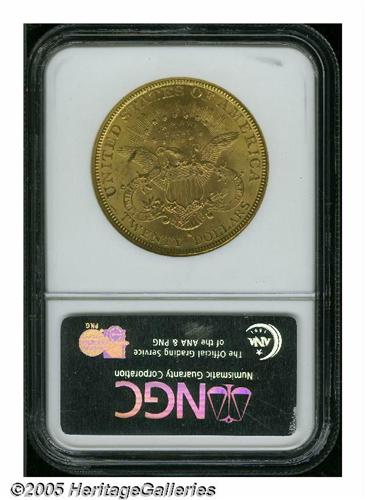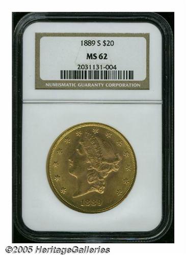 <B>1889-S<$20> MS62 NGC.</B></I> This '89-S double eagle displays peach-gold patina with light tan and green undertones over soft luster. The design features are well impressed. Minute contact marks are noted on Liberty's cheek and scattered throughout the obverse fields. <BR><I>Ex: Stack's (January 1986), lot 507.</B></I>
