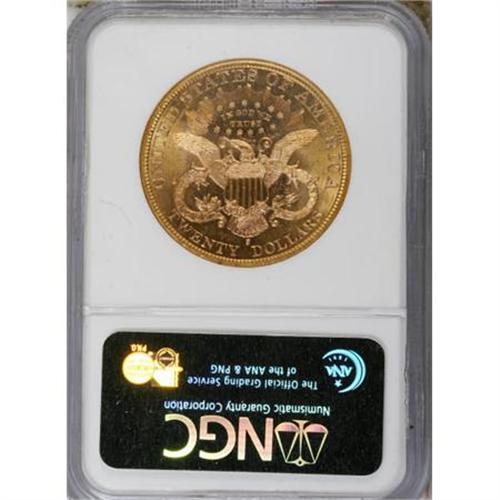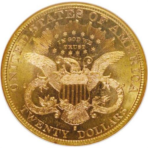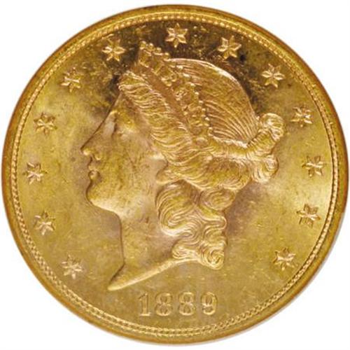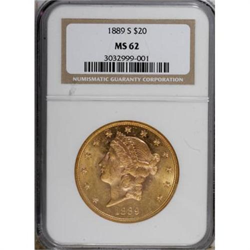 <B>1889-S $20 MS62 NGC.</B></I> NGC Census: (411/81). PCGS Population (570/258). Mintage: 774,700. Numismedia Wsl. Price for NGC/PCGS coin in MS62: $825. (#9012)<BR><BR><B>Coin Engraver:</B> James B. Longacre<BR><BR><b>Shipping:</b> Coins & Currency (<a target="_blank" href="http://www.heritageauctions.com/common/shipping.php">view shipping information</a>\)