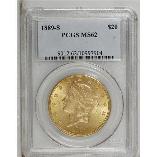 <B>1889-S $20 MS62 PCGS.</B></I> A well struck and lustrous peach-gold piece that has light abrasions on the devices. A handful of long, thin marks affect Liberty's cheek, which is clean for the grade otherwise.<BR><BR><b>Shipping:</b> Coin/Currency (<a target="_blank" href="http://www.heritageauctions.com/common/shipping.php">view shipping information</a>)