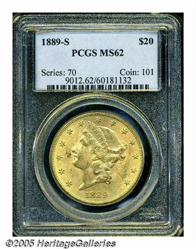<B>1889-S<$20> MS62 PCGS.</B></I> Light yellow-gold with splashes of dark and natural patina. A pleasing example with above average surfaces for the grade.