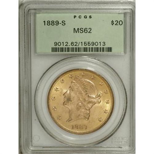 <B>1889-S $20 MS62 PCGS.</B></I> This sun-gold twenty exhibits unbroken luster, and is smooth for the grade despite minor marks on the cheek. Certified in a green label holder.<BR><I>From The Vanek Collection.</B></I><BR><BR><b>Shipping:</b> Coins & Currency (<a target="_blank" href="http://www.heritageauctions.com/common/shipping.php">view shipping information</a>)