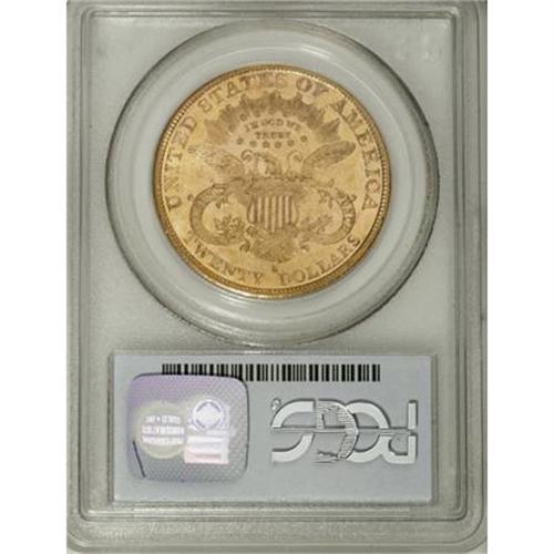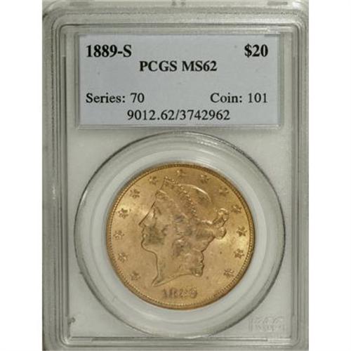 <B>1889-S $20 MS62 PCGS.</B></I> PCGS Population (550/254). NGC Census: (407/81). Mintage: 774,700. Numismedia Wsl. Price for NGC/PCGS coin in MS62: $825. (#9012)<BR><BR><B>Coin Engraver:</B> James B. Longacre<BR><BR><b>Shipping:</b> Coins & Currency (<a target="_blank" href="http://www.heritageauctions.com/common/shipping.php">view shipping information</a>\)