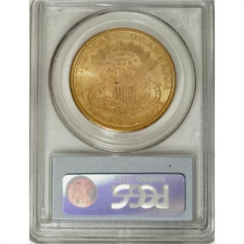 <B>1889-S $20 MS62 PCGS.</B></I> A lustrous yellow-gold example with a solitary tiny blue spot on the shield. There are a few small marks on the jaw and near the profile, but overall, the surfaces are clean for the designated grade.<BR><BR><B>Coin Engraver:</B> James B. Longacre<BR><BR><b>Shipping:</b> Coins & Currency (<a target="_blank" href="http://www.heritageauctions.com/common/shipping.php">view shipping information</a>)