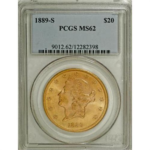 <B>1889-S $20 MS62 PCGS.</B></I> Warm wheat-gold surfaces display powerful luster and benefit from a full strike. Some light marks on Liberty's cheek, including a scratch near her mouth possibly limit the grade.<BR><BR><B>Coin Engraver:</B> James B. Longacre<BR><BR><b>Shipping:</b> Coins & Currency (<a target="_blank" href="http://www.heritageauctions.com/common/shipping.php">view shipping information</a>)