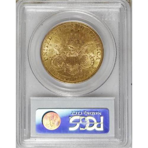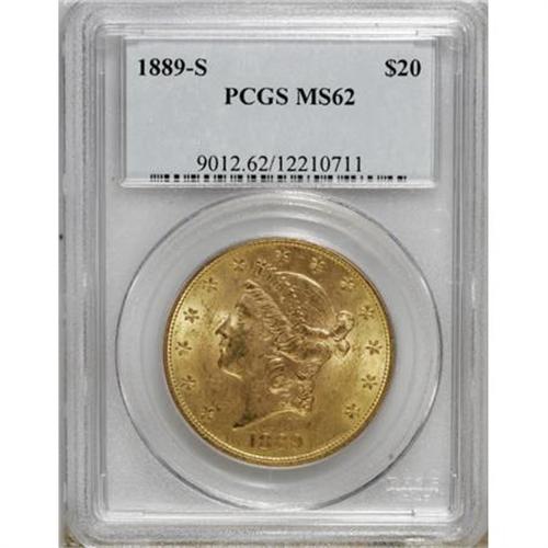 <B>1889-S $20 MS62 PCGS.</B></I> . PCGS Population (612/268). NGC Census: (423/85). Mintage: 774,700. Numismedia Wsl. Price for NGC/PCGS coin in MS62: $1,075. (#9012)<BR><BR><B>Coin Engraver:</B> James B. Longacre<BR><BR><b>Shipping:</b> Coins & Currency (<a target="_blank" href="http://www.heritageauctions.com/common/shipping.php">view shipping information</a>)