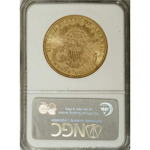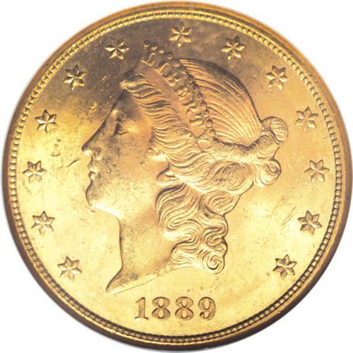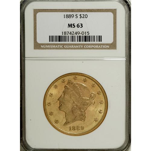 <B>1889-S $20 MS63 NGC.</B></I> A reflective Mint State piece with wisps of pink toning over light yellow gold surfaces. This is an important entry into the lineup of conditionally rare San Francisco Mint double eagles that are common in the lowest Mint State grades but rare in the middle numerical levels, as indicated by the NGC population. Census: 76 in 63, 4 finer (4/07).<BR><BR><b>Shipping:</b> Coins & Currency (<a target="_blank" href="http://www.heritageauctions.com/common/shipping.php">view shipping information</a>)