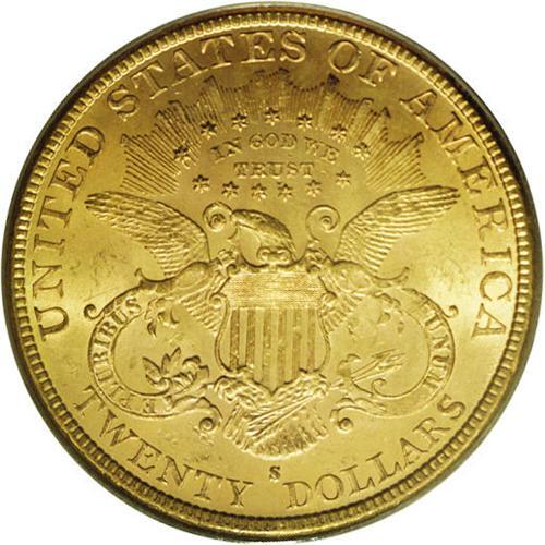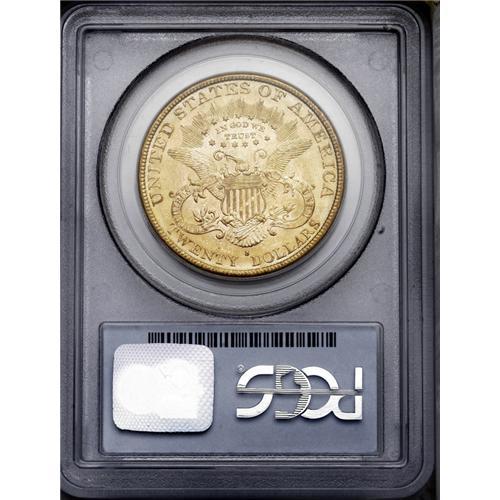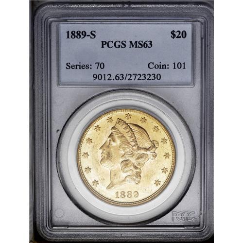 <B>1889-S<$20> MS63 PCGS.</B></I> While not especially difficult in this grade, the availability of specimens in higher grades drops precipitously. This is a well struck example that has rich reddish-orange mint frost and is lightly abraded. <BR><BR><B>Important notice:</B> Heritage usually auctions material at the rate of 200-250 lots per hour. On some occasions eBay Live bid software or the Internet may not be able to keep up with the pace of the auction. We recommend placing a realistic absentee bid now as insurance to avoid disappointment. Occasionally the auctioneer may eliminate or reject an eBay Live bid, and the auctioneer may also reopen a lot after the close of the eBay live bidding (usually because we missed an audience bid), and may reject your bid even if it shows you as the winning bidder. By bidding via eBay Live, you agree that Heritage may award the lot to another bidder at its sole discretion under the circumstances described above or any other reasonable circumstances. Since eBay bids are not shown to us until we open the lot on the floor, we treat those bids just like floor bids. In most cases the floor responds before the eBay bid is presented to us, due to Internet lag time, so for consistency we have made it a policy that floor bids are always considered first over tie eBay live bids. Also please note that all Heritage lots purchased through eBay Live carry a 20% Buyer's Premium. Please make sure you read the Terms and Conditions before you bid. This lot is being auctioned in conjunction with a live floor auction by Heritage Galleries & Auctioneers. All final auction and invoice information will be supplied by Heritage Galleries & Auctioneers, and all other information should be considered preliminary. Lot:4321 <BR><BR><B>Winning Notification and Billing:</B> After the FINAL session in this auction is complete, Heritage will send e-mail and snail mail invoices. This process normally takes several days. All final auction and invoice information will be supplied by Heritage Galleries & Auctioneers, and all other information should be considered preliminary. <BR><BR>This auction will be conducted on a live auction floor and over the Internet through eBay Live. If you choose to place an absentee bid, please take a moment to <font color='#0000ff'><u><a href='http://pages.ebay.com/liveauctions/help/before/laabsentee.html'>learn how eBay Live absentee bidding works</a></u></font><font color='#000000'>