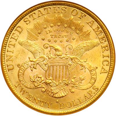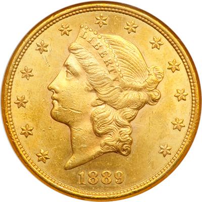 1889-S $20. NGC graded MS-61. Gorgeous golden orange sunset toning; a few shallow marks. Lustrous.