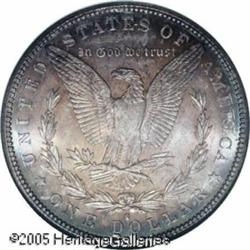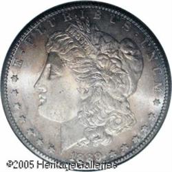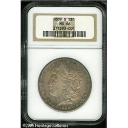 <B>1889-S<img border='0' src='http://www.heritagecoins.com/images/star.gif' width=10 height=10>$1 MS66 NGC.</B></I> This is most certainly not from the Redfield Hoard. It simply has none of the characteristics of the coins from that massive holding of Dollars. The cheek of Liberty is smooth and problem-free, and each side is covered with a lovely mixture of golden and lilac toning with strong underlying mint frost. Very scarce in such a superior state of preservation. Population: 18 in 66, 0 finer (1/05).<BR><I>From The Banks Collection.</B></I> Lot:10314
