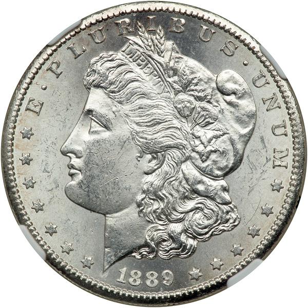 1889-S Morgan Dollar. NGC graded MS-64. A totally untoned example, lustrous and gleaming. What's more, '89-S has fewer than a million mintage, or 700,000 to be exact (PCGS # 7194) .