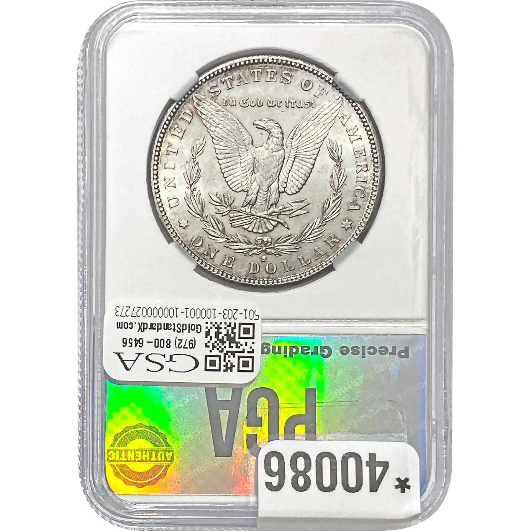 e. Coins sold referencing a third-party grading service are sold “AS IS” without any express or implied warranty, except for a guarantee by GSA that they are genuine. Removal or alteration of the holder, voids all of Bidder’s claims concerning that Product. Certain warranties may be available from the grading services and Bidders are referred to them for further details: Numismatic Guaranty Corporation (NGC), PO Box 4776, Sarasota, FL 34230, www.ngccoin.com/services/writtenguarantee.asp; Professional Coin Grading Services (PCGS), PO Box 9458, Newport Beach, CA 92658, www.pcgs.com/guarantee.html; ANACS, 6555 S. Kenton St., Ste. 303, Englewood, CO 80111; and Independent Coin Grading Co. (ICG), 7901 East Bellview, Ave., Suite 50, Englewood, CO 80111.
