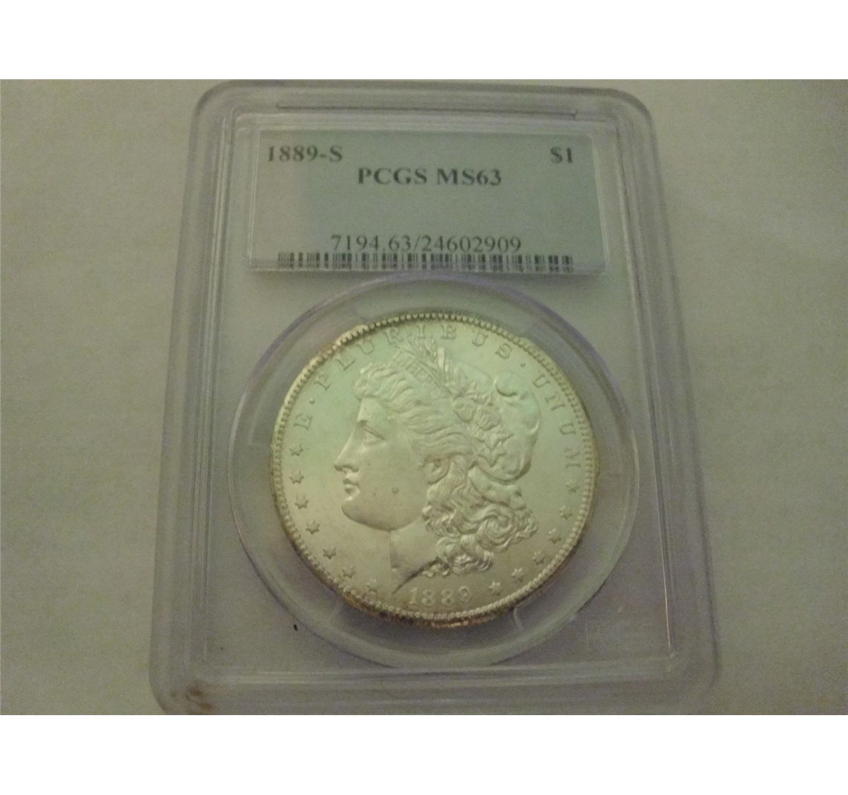 1889-S PCGS MS-63 MORGAN SILVER DOLLAR.