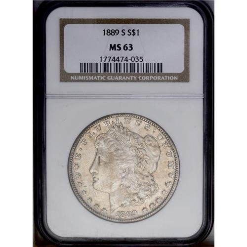 <B>1889-S<img border='0' src='http://www.heritagecoins.com/images/star.gif' width=10 height=10>$1> MS63 NGC.</B></I> Soft luster peeks through light golden-gray patination, and the design elements are sharply impressed, including good definition in the hair curl above the ear and on the eagle's breast feathers. Minute marks are scattered about the obverse, defining the grade. <BR><BR><B>Important notice:</B> Heritage usually auctions material at the rate of 200-250 lots per hour. On some occasions eBay Live bid software or the Internet may not be able to keep up with the pace of the auction. We recommend placing a realistic absentee bid now as insurance to avoid disappointment. Occasionally the auctioneer may eliminate or reject an eBay Live bid, and the auctioneer may also reopen a lot after the close of the eBay live bidding (usually because we missed an audience bid), and may reject your bid even if it shows you as the winning bidder. By bidding via eBay Live, you agree that Heritage may award the lot to another bidder at its sole discretion under the circumstances described above or any other reasonable circumstances. Since eBay bids are not shown to us until we open the lot on the floor, we treat those bids just like floor bids. In most cases the floor responds before the eBay bid is presented to us, due to Internet lag time, so for consistency we have made it a policy that floor bids are always considered first over tie eBay live bids. Also please note that all Heritage lots purchased through eBay Live carry a 20% Buyer's Premium. Please make sure you read the Terms and Conditions before you bid. This lot is being auctioned in conjunction with a live floor auction by Heritage Galleries & Auctioneers. All final auction and invoice information will be supplied by Heritage Galleries & Auctioneers, and all other information should be considered preliminary. Lot:3525 <BR><BR><B>Winning Notification and Billing:</B> After the FINAL session in this auction is complete, Heritage will send e-mail and snail mail invoices. This process normally takes several days. All final auction and invoice information will be supplied by Heritage Galleries & Auctioneers, and all other information should be considered preliminary. <BR><BR>This auction will be conducted on a live auction floor and over the Internet through eBay Live. If you choose to place an absentee bid, please take a moment to <font color='#0000ff'><u><a href='http://pages.ebay.com/liveauctions/help/before/laabsentee.html'>learn how eBay Live absentee bidding works</a></u></font><font color='#000000'>