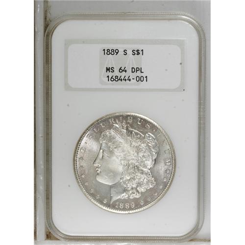 <B>1889-S S$1 MS64 Deep Mirror Prooflike NGC.</B></I> Blushes of delicate champagne iridescence ring the peripheries of this otherwise brilliant-white near-Gem. The surfaces are mirrored on both sides--an uncommon feature for the issue--and the devices are sharply impressed in all areas. A minimally abraded and conditionally scarce representative of this low mintage (700,000 pieces), always-popular Morgan Dollar from the San Francisco Mint.<BR><BR><b>Shipping:</b> Coins & Currency (<a target="_blank" href="http://www.heritageauctions.com/common/shipping.php">view shipping information</a>)