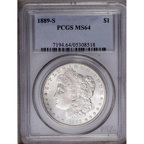 <B>1889-S<img border='0' src='http://www.heritagecoins.com/images/star.gif' width=10 height=10>$1> MS64 PCGS.</B></I> A well struck piece with strong luster. This near-Gem has hints of pale blue toning at the reverse periphery and shows few marks for the grade.