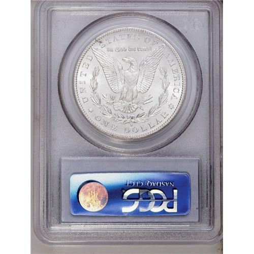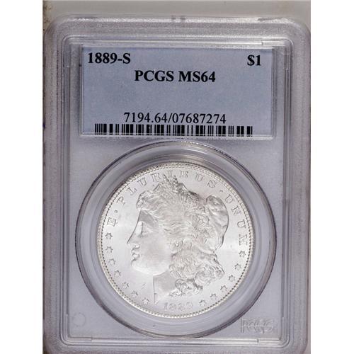 <B>1889-S<img border='0' src='http://www.heritagecoins.com/images/star.gif' width=10 height=10>$1> MS64 PCGS.</B></I> Choice and mostly untoned with the flashy luster that often marks this issue. The devices are solidly struck and lightly frosted, while the fields display some small marks appropriate for the grade.