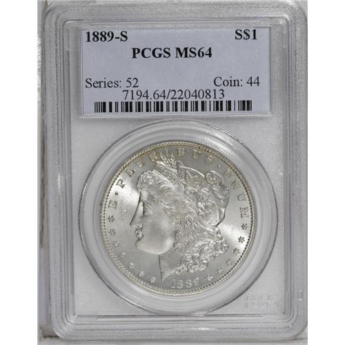 <B>1889-S<img border='0' src='http://www.heritagecoins.com/images/star.gif' width=10 height=10>$1> MS64 PCGS.</B></I> One of the scarcer Redfield issues and elusive in near-Gem condition. This is a sharply struck and untoned example with thick mint frost over each side. Only slightest abrasions are noted.