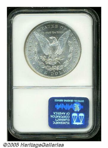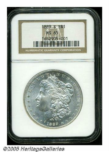<B>1889-S<S$1> MS65 NGC.</B></I> A highly lustrous Gem that has beautifully preserved fields and a whisper of tan patina on Liberty's cheek. The design elements are well struck aside from the hair curl just above the ear. A few very tiny marks on Liberty's cheek do not distract. NGC has certified just 19 pieces higher (5/05).