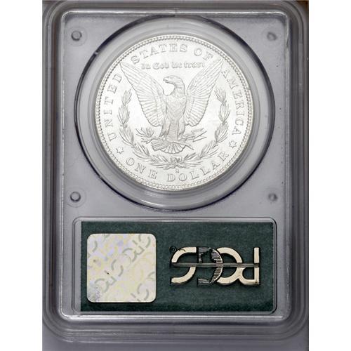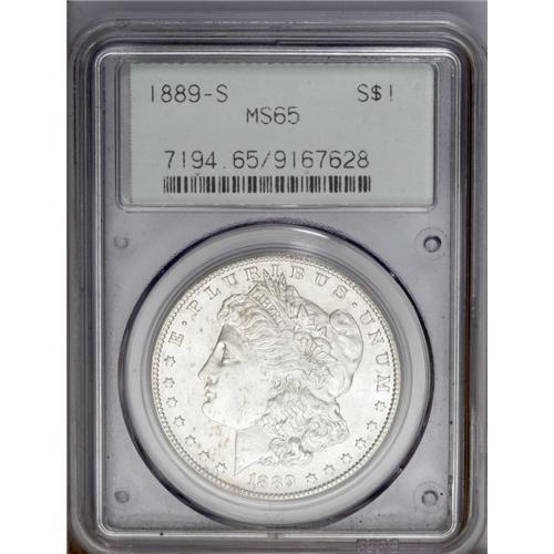<B>1889-S<img border='0' src='http://www.heritagecoins.com/images/star.gif' width=10 height=10>$1 MS65 PCGS.</B></I> Bright lustrous surfaces display freckles of milky toning on the left side of the obverse. The design features are well impressed, except for minor softness in the hair over Liberty's ear. A few minor marks on Liberty's cheek and neck are mentioned for accuracy.