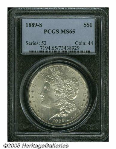 <B>1889-S<S$1> MS65 PCGS.</B></I> Shimmering surfaces that are only slightly touched by milky toning, and are particularly clean for this generally abraded "Redfield" issue. A sharply struck Gem.
