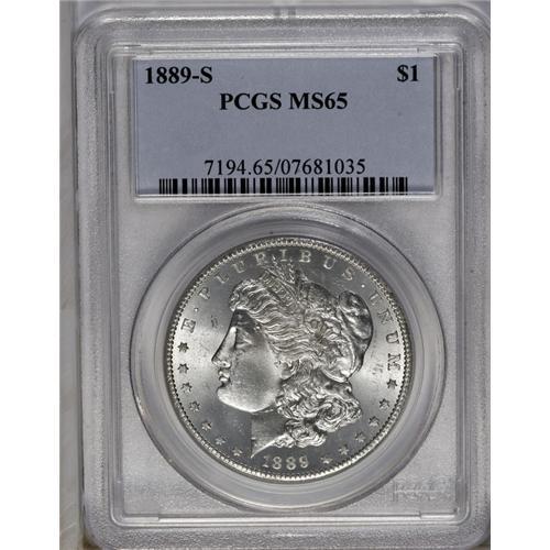 <B>1889-S<img border='0' src='http://www.heritagecoins.com/images/star.gif' width=10 height=10>$1> MS65 PCGS.</B></I> Shimmering surfaces that are completely untoned and particularly clean for this often heavily abraded Redfield issue. A highly collectible Gem example.