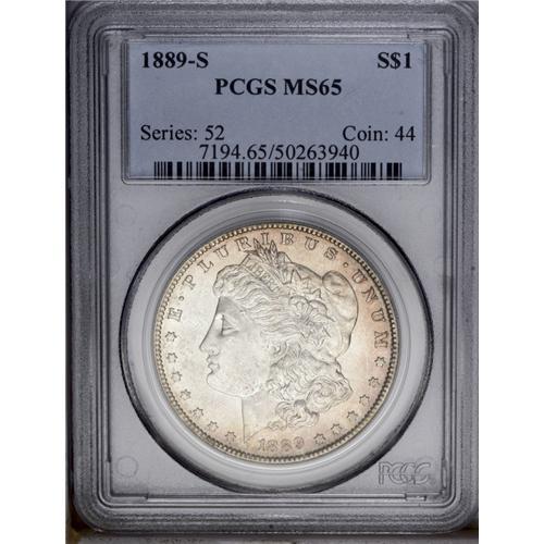 <B>1889-S<img border='0' src='http://www.heritagecoins.com/images/star.gif' width=10 height=10>$1> MS65 PCGS.</B></I> The strike is bold with shimmering luster, and just a few light ticks keep this coin from an even higher grade. The reverse is brilliant white, while the obverse has a touch of champagne peripheral toning. <BR><BR><B>Important notice:</B> Heritage usually auctions material at the rate of 200-250 lots per hour. On some occasions eBay Live bid software or the Internet may not be able to keep up with the pace of the auction. We recommend placing a realistic absentee bid now as insurance to avoid disappointment. Occasionally the auctioneer may eliminate or reject an eBay Live bid, and the auctioneer may also reopen a lot after the close of the eBay live bidding (usually because we missed an audience bid), and may reject your bid even if it shows you as the winning bidder. By bidding via eBay Live, you agree that Heritage may award the lot to another bidder at its sole discretion under the circumstances described above or any other reasonable circumstances. Since eBay bids are not shown to us until we open the lot on the floor, we treat those bids just like floor bids. In most cases the floor responds before the eBay bid is presented to us, due to Internet lag time, so for consistency we have made it a policy that floor bids are always considered first over tie eBay live bids. Also please note that all Heritage lots purchased through eBay Live carry a 20% Buyer's Premium. Please make sure you read the Terms and Conditions before you bid. This lot is being auctioned in conjunction with a live floor auction by Heritage Galleries & Auctioneers. All final auction and invoice information will be supplied by Heritage Galleries & Auctioneers, and all other information should be considered preliminary. Lot:3530 <BR><BR><B>Winning Notification and Billing:</B> After the FINAL session in this auction is complete, Heritage will send e-mail and snail mail invoices. This process normally takes several days. All final auction and invoice information will be supplied by Heritage Galleries & Auctioneers, and all other information should be considered preliminary. <BR><BR>This auction will be conducted on a live auction floor and over the Internet through eBay Live. If you choose to place an absentee bid, please take a moment to <font color='#0000ff'><u><a href='http://pages.ebay.com/liveauctions/help/before/laabsentee.html'>learn how eBay Live absentee bidding works</a></u></font><font color='#000000'>