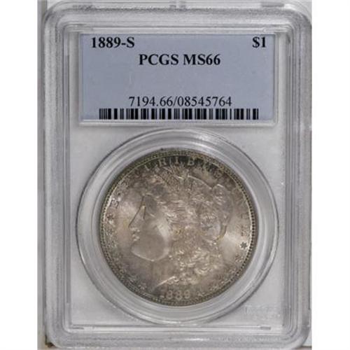 <B>1889-S $1 MS66 PCGS.</B></I> Splashes of orange, olive, and gunmetal-gray embrace this fully lustrous and crisply struck Premium Gem. Impeccably preserved, and worthy of the finest collection. The 1889-S is more collectible in Mint State than its production of 700,000 pieces suggests, but the issue emerges as an underappreciated rarity at the MS66 level. Population: 62 in 66, 1 finer (9/07).<BR><BR><B>Coin Engraver:</B> George T. Morgan<BR><BR><b>Shipping:</b> Coin/Currency (<a target="_blank" href="http://www.heritageauctions.com/common/shipping.php">view shipping information</a>)