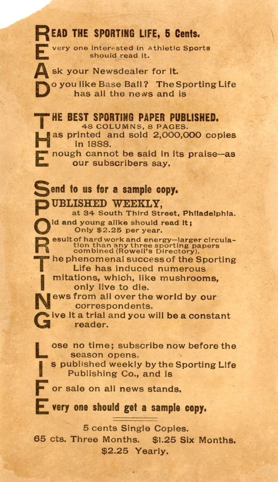 This trade card was used to promote a popular sports publication. Size 4'' x 7'', Condition: Very Good Condition Missing Top Corner, Sold as is (Please see pictures)