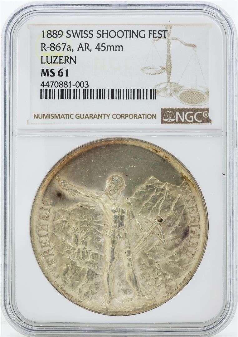 One 1889 Swiss Shooting Fest R-867a AR 45mm Luzern Coin NGC MS61. NGC Certified.