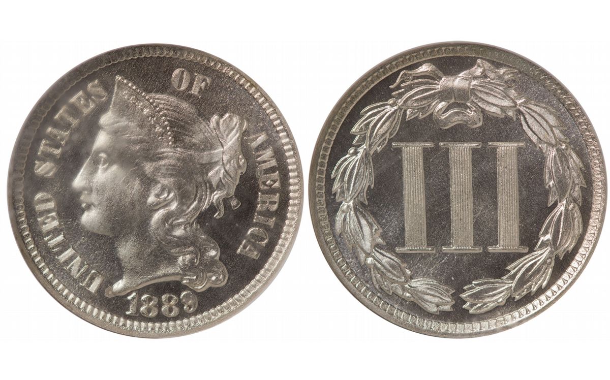 1889 A very high end 3c coin, which although not noted on the holder, could easily grade ‘Cameo.’ A beautiful coin which is virtually un-improvable and destined for the finest of type sets or possibly a high end date set. There are no blemishes or marks of any kind which should be expected on a PF67 coin and the fields are fully reflective with a cameo appearance on both obvers and reverse. HKA#63482