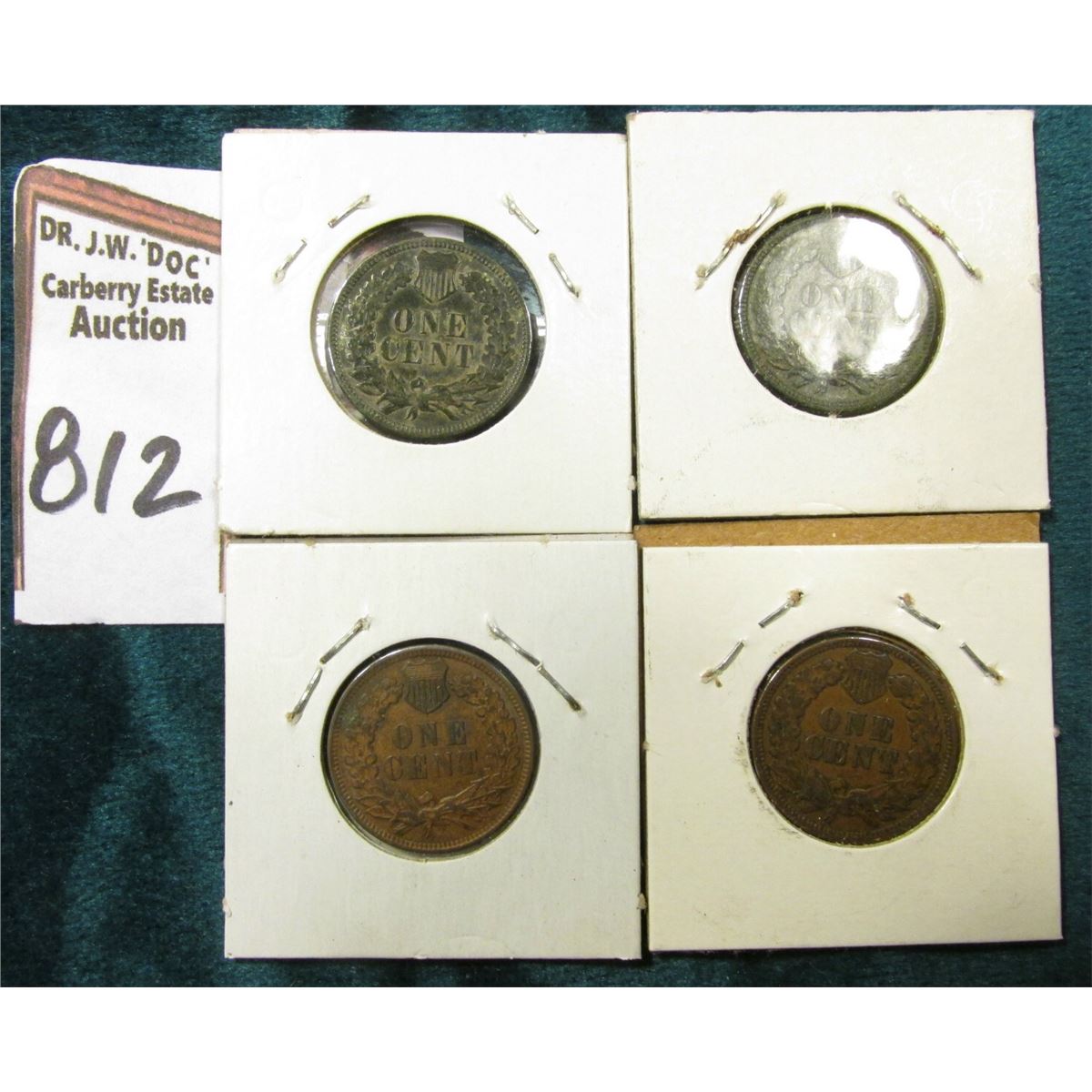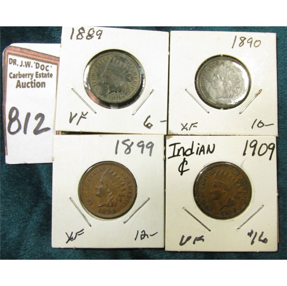 1889 VF tarnish, 1890 EF some tarnish, 1899 EF, & 1909 VF Indian Head Cents.