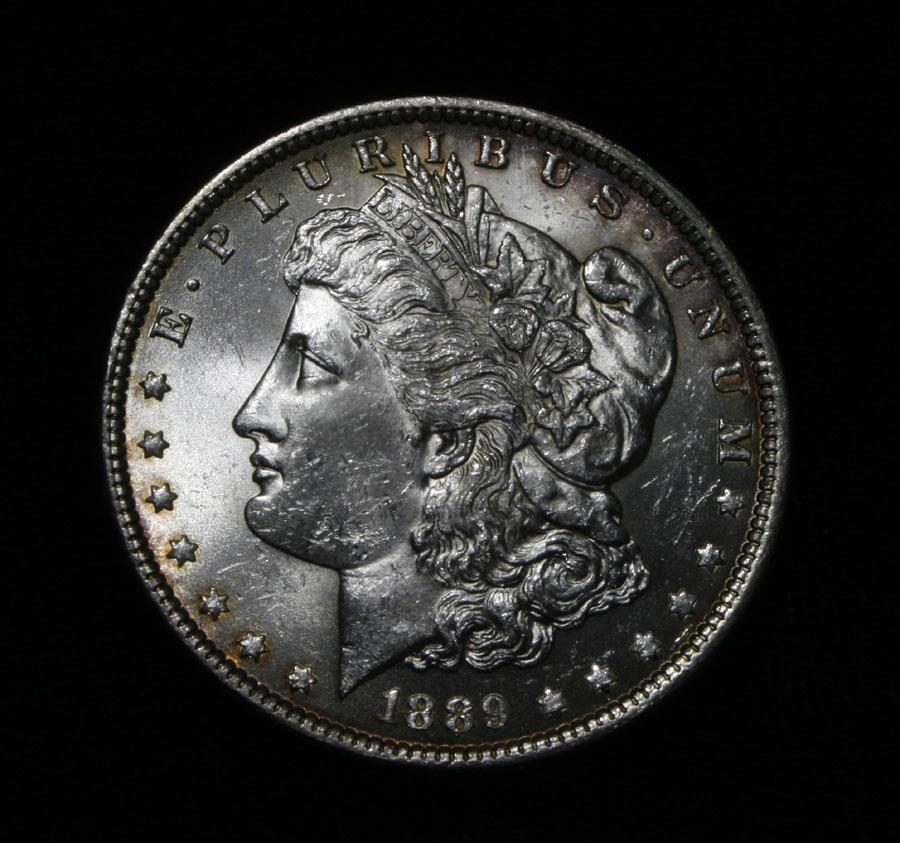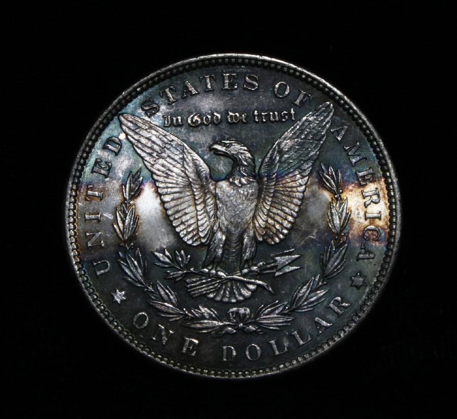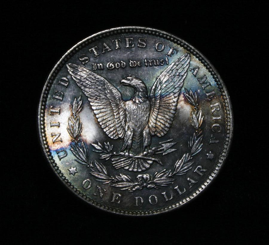 super example with deep blues on the reverse with great banded toning. The edges of the whitish band are deep cobalt blues. A dynamite coin. Estimated Value $150