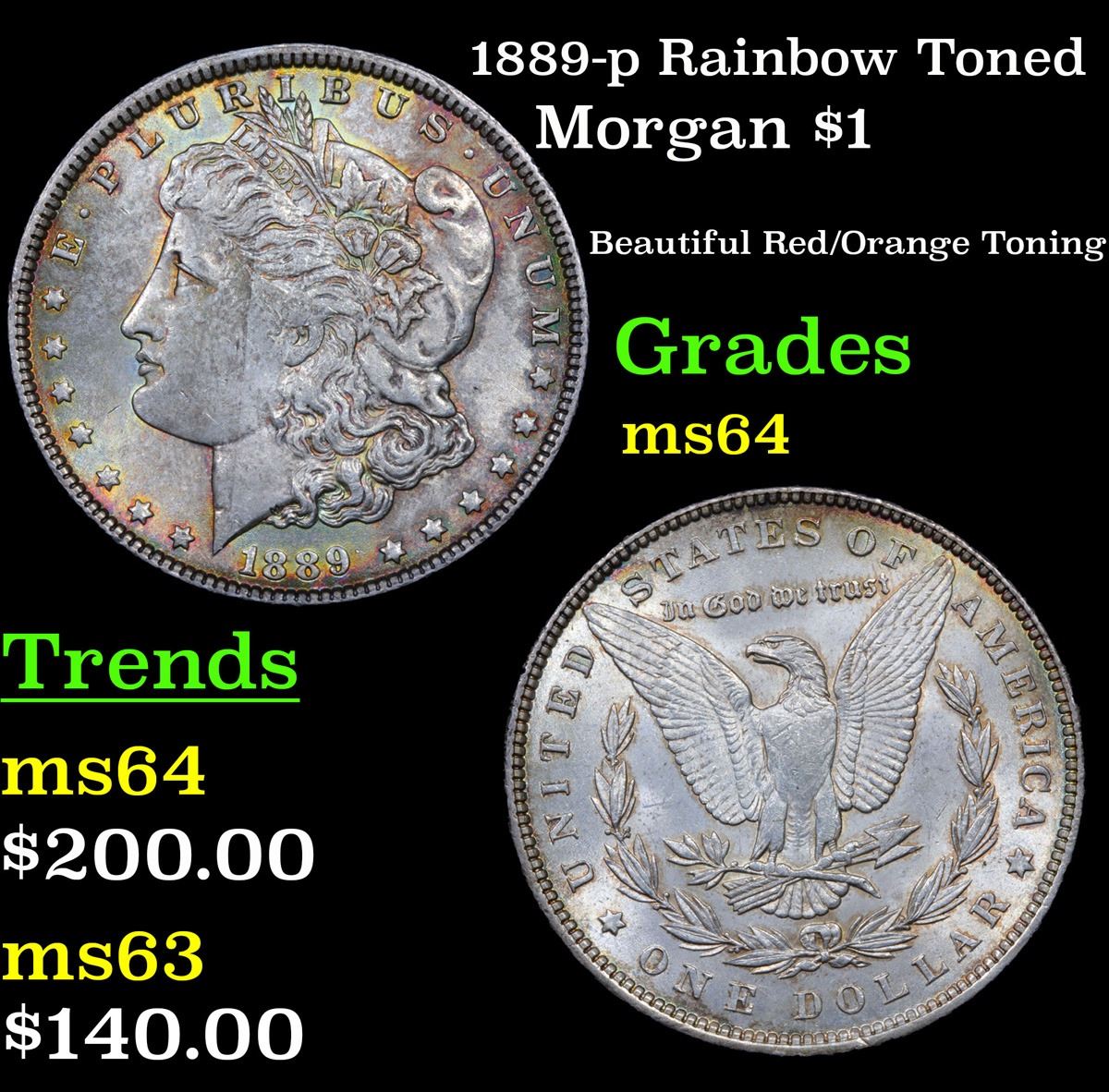 1889-p Rainbow Toned Morgan Dollar $1 Grades Choice Unc.