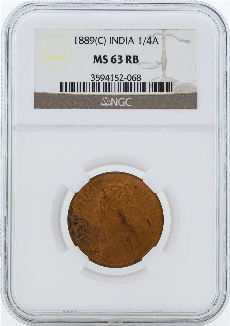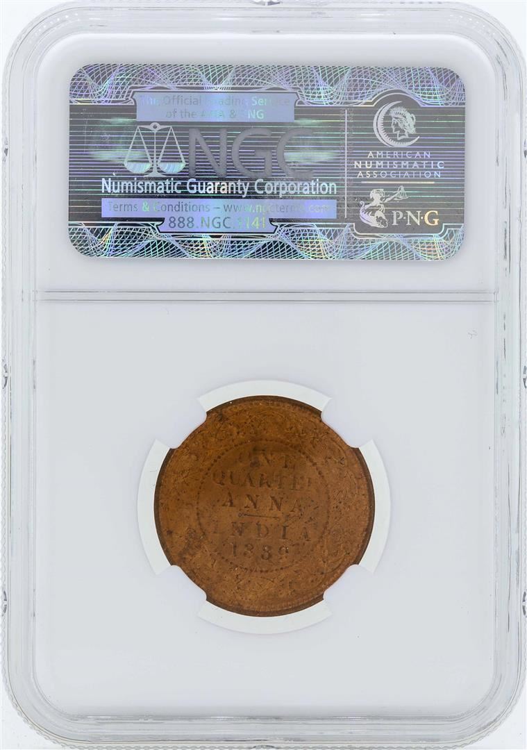 One 1889C India 1/4 Anna Coin NGC MS63RB. NGC Certified.