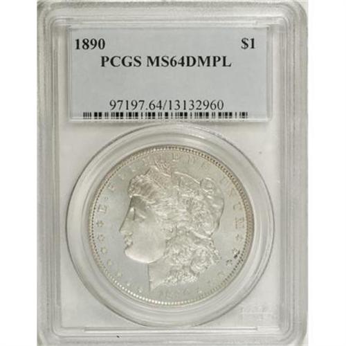 <B>1890 $1 MS64 Deep Mirror Prooflike PCGS.</B></I> At first glance, this gorgeous Mint State piece looks like a proof, due to the extremely deep mirrors on each side. The devices are lustrous with moderate mint frost. This date is not particularly known for prooflike coins, thus this example will provide an excellent opportunity for the advanced collector. Population: 65 in 64, 6 finer (6/07).<BR><BR><b>Shipping:</b> Coins & Currency (<a target="_blank" href="http://www.heritageauctions.com/common/shipping.php">view shipping information</a>)