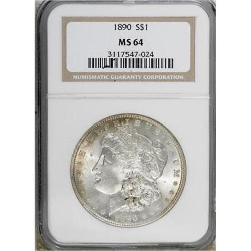 <B>1890 $1 MS64 NGC.</B></I> NGC Census: (3149/233). PCGS Population (2505/346). Mintage: 16,802,590. Numismedia Wsl. Price for NGC/PCGS coin in MS64: $116. (#7196)<BR><BR><B>Coin Engraver:</B> George T. Morgan<BR><BR><b>Shipping:</b> Coins & Currency (<a target="_blank" href="http://www.heritageauctions.com/common/shipping.php">view shipping information</a>)
