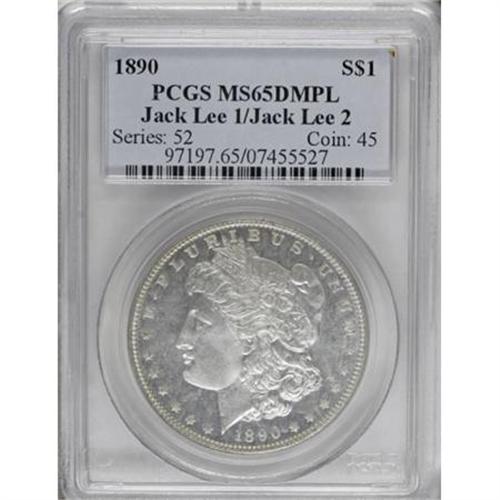 <B>1890 $1 MS65 Deep Mirror Prooflike PCGS.</B></I> Ex: Jack Lee 1, Jack Lee 2. After Jack Lee sold his first legendary collection of DMPL Morgan dollars, he formed a second world-class holding. His search for the finest pieces sometimes meant acquiring the same coin once again for the second set, and such is the case with the present brilliant and boldly struck Gem. The major devices demonstrate moderate contrast with the reflective fields, and a thorough inspection of the surfaces fails to reveal any significant contact. The cheek is particularly smooth. The outstanding quality is further confirmed by its important pedigree. Population: 6 in 65 Deep Mirror Prooflike, 0 finer (11/07).<BR><BR><b>Shipping:</b> Coins & Currency (<a target="_blank" href="http://www.heritageauctions.com/common/shipping.php">view shipping information</a>)