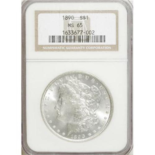 <B>1890 $1 MS65 NGC.</B></I> Booming luster and light almond-gold toning endow this nicely struck and unblemished Gem. Only six pieces have been certified in higher grades by NGC and PCGS combined (10/07).<BR><BR><B>Coin Engraver:</B> George T. Morgan<BR><BR><b>Shipping:</b> Coins & Currency (<a target="_blank" href="http://www.heritageauctions.com/common/shipping.php">view shipping information</a>)