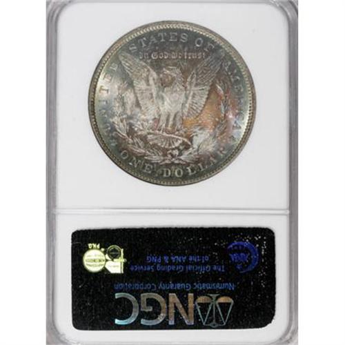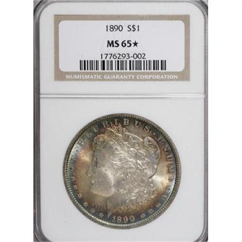<B>1890 $1 MS65 <img src="/images/star.gif" width="10" height="10" alt="" border="0"> NGC.</B></I> Rich golden-brown, plum-red, and ocean-blue endow this lustrous and suitably struck Gem. Well preserved despite a few delicate facial grazes. Nearly unobtainable in higher grades.<BR><BR><B>Coin Engraver:</B> George T. Morgan<BR><BR><b>Shipping:</b> Coins & Currency (<a target="_blank" href="http://www.heritageauctions.com/common/shipping.php">view shipping information</a>)