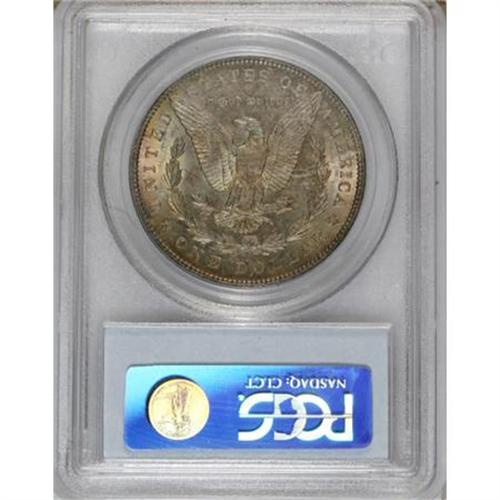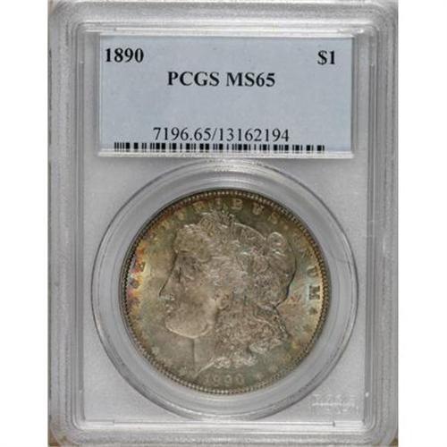 <B>1890 $1 MS65 PCGS.</B></I> Aquamarine, cherry-red, and yellow-gold enrich this lustrous and refreshingly unabraded Gem. The hair above the ear and the eagle's breast are slightly incomplete. Given its mintage of 16.8 million pieces, the 1890 is surprisingly rare above the MS65 level.<BR><BR><b>Shipping:</b> Coins & Currency (<a target="_blank" href="http://www.heritageauctions.com/common/shipping.php">view shipping information</a>)