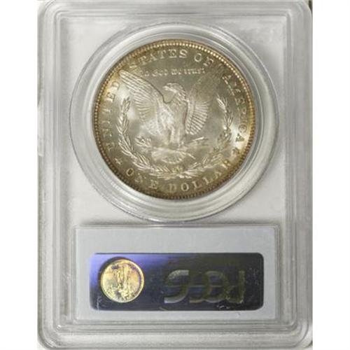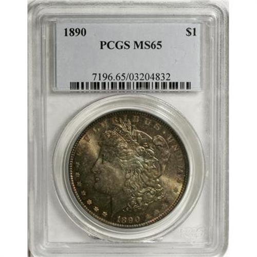 <B>1890 $1 MS65 PCGS.</B></I> Strongly lustrous with above-average detail for this mid-date Philadelphia issue. The obverse offers dusky gold-orange and jade patina, while the reverse shows similar peripheral colors around an untoned center. While available as a Gem, the 1890 is extremely rare any finer; PCGS has certified just one such coin (8/07).<BR><BR><B>Coin Engraver:</B> George T. Morgan<BR><BR><b>Shipping:</b> Coins & Currency (<a target="_blank" href="http://www.heritageauctions.com/common/shipping.php">view shipping information</a>)
